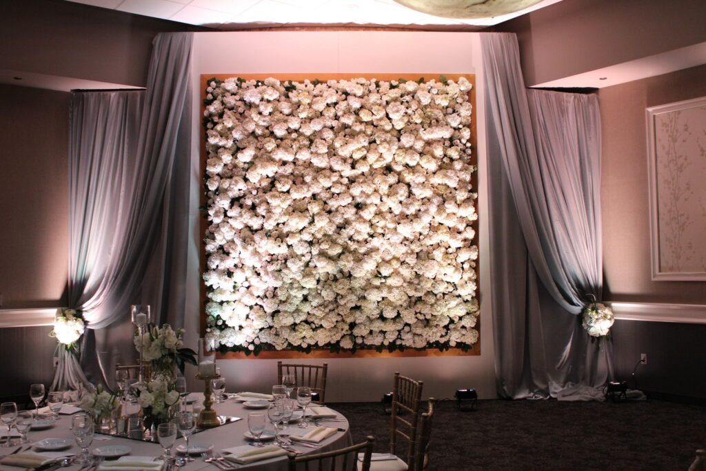 The custom built, fresh flower wall with over 1,000 blooms and subtle glistens of mirror tiles was the perfect backdrop as guests entered the room.