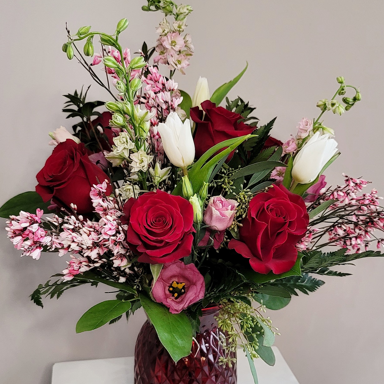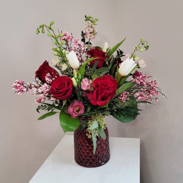 A perfect Valentine’s array of reds, pinks, and whites that is both classic and timeless with a modern twist. Elegant blooms of a half dozen red roses mixed with tulips and garden flowers are gathered in a patterned red or pink glass vase.
