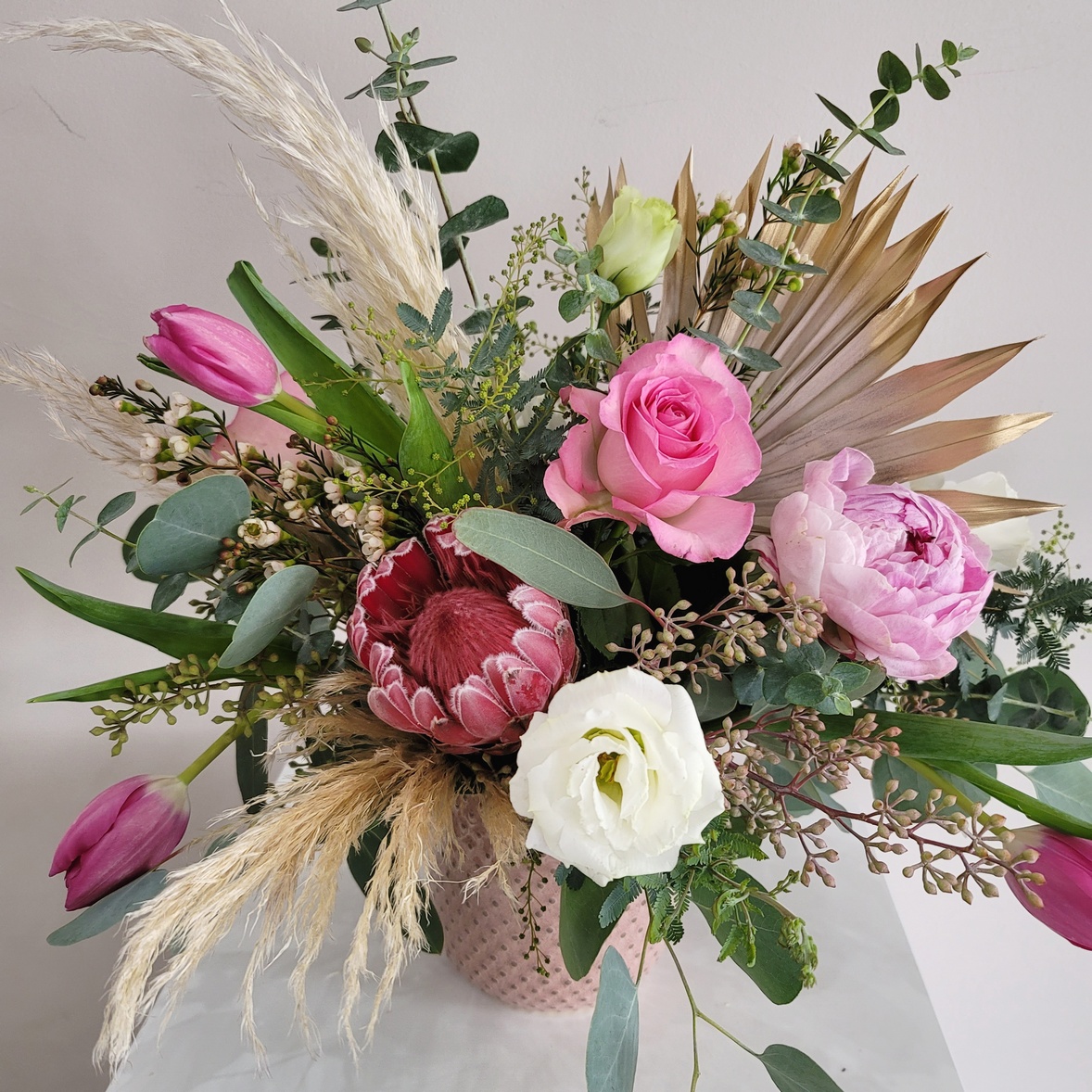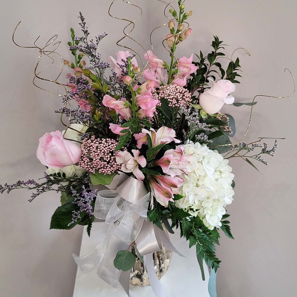 Fresh floral arrangement of designer’s choice seasonal flowers in glass vase. Currently Valentine’s and spring arrangements will include a mixture of feminine colored blooms amidst a bed of mixed foliage and textured fillers. If you have specific color or flower preferences, please indicate below in the section “Notes for Florist”.