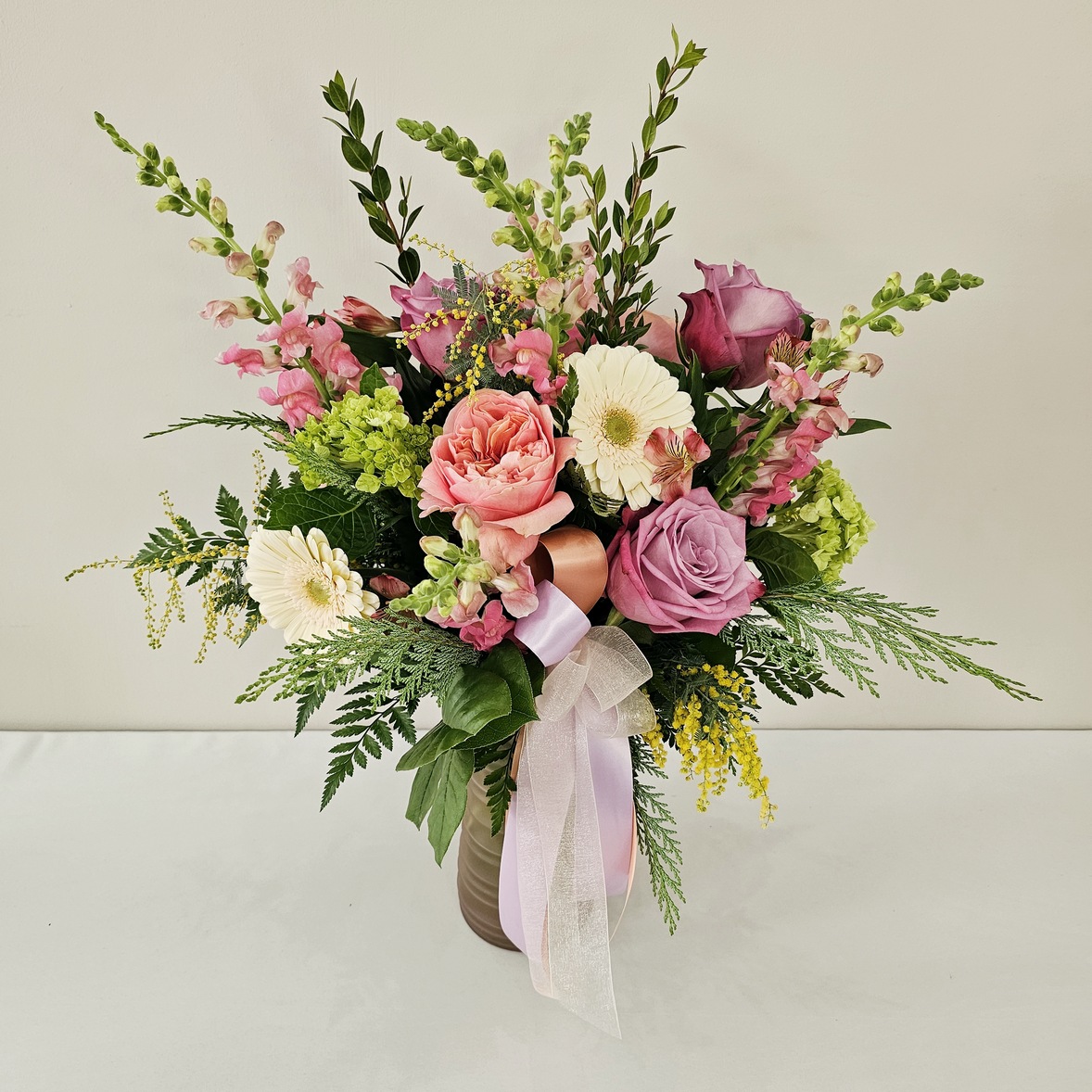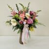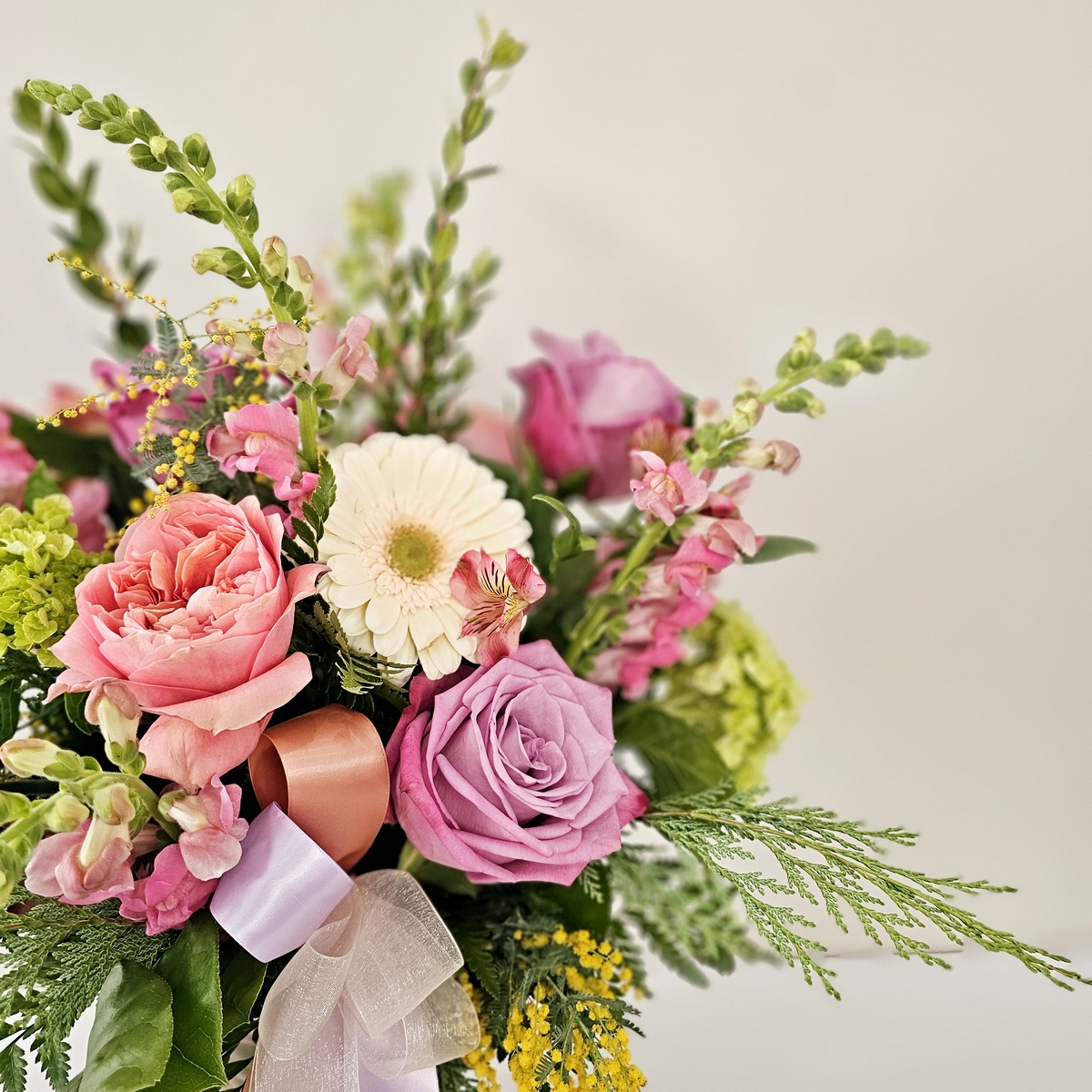 A beautiful, soft yet cheerful mix of pastel flowers including roses, gerbera daisy, snapdragons, and hydrangea embody dreamy springtime. Gorgeous for a number of occasions! Flowers arranged in a colored glass vase.