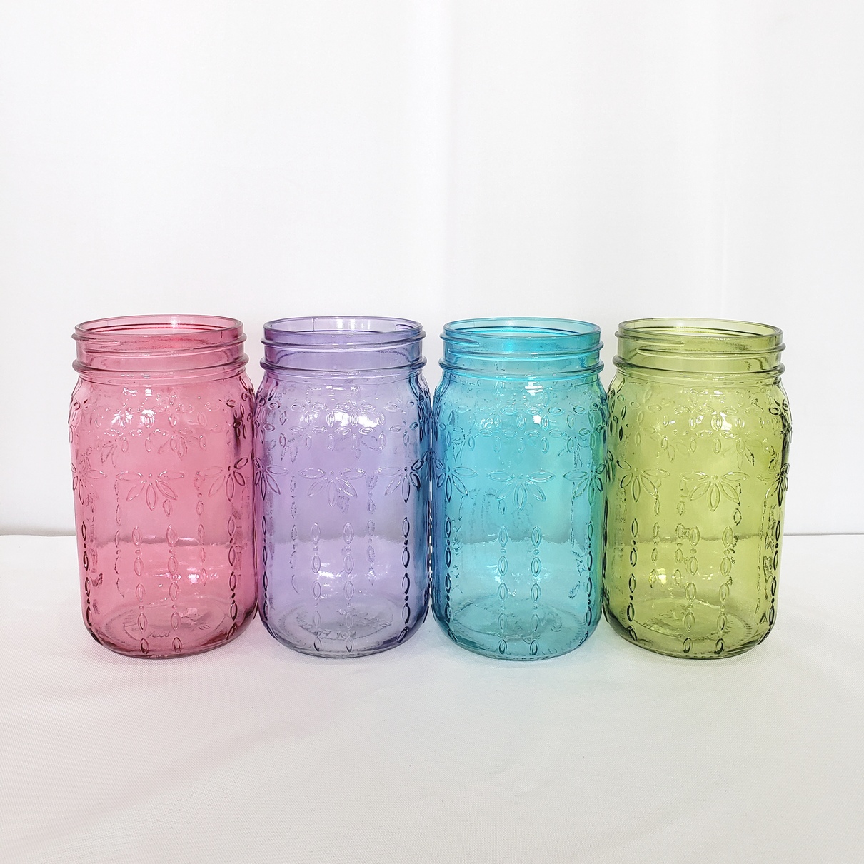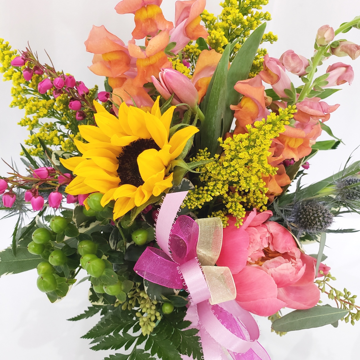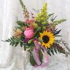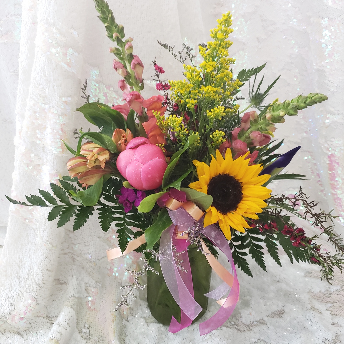 Bursting with color, this tinted glass jar of seasonal garden style wildflowers is sure to bring joy and cheer. Festive ribbons complete this eye-catching design. *Assorted vase colors, color not guaranteed.