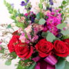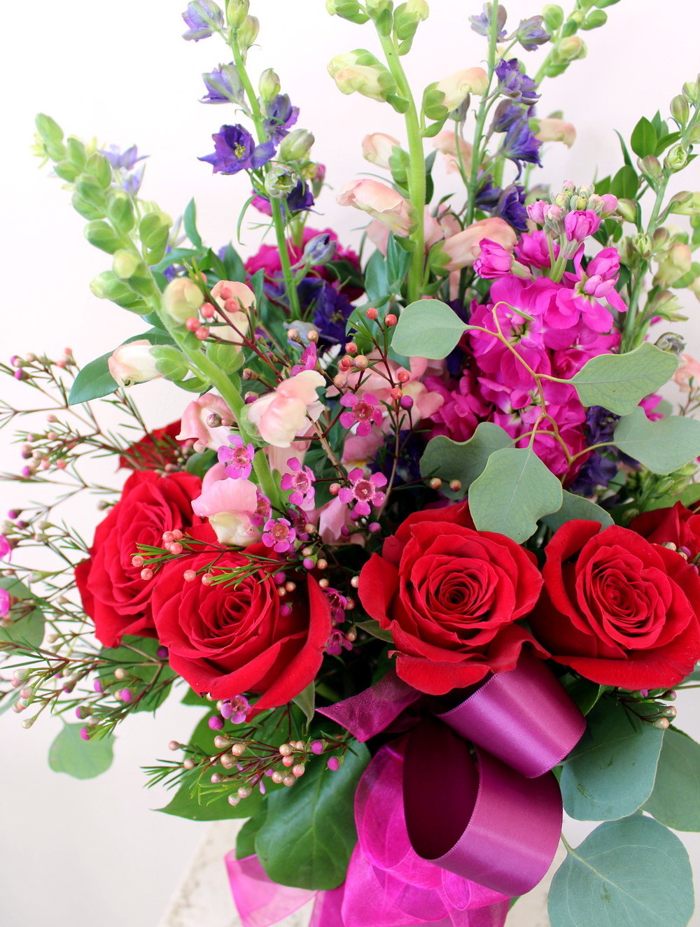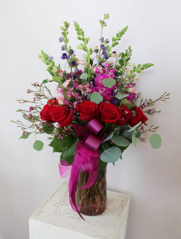 Modern grouping of a dozen luscious red roses with rich snapdragons, stock, and fillers in a glass vase. Sleek greenery and bow finish this contemporary presentation. An impressive option to gift a dozen roses in an unexpected display.