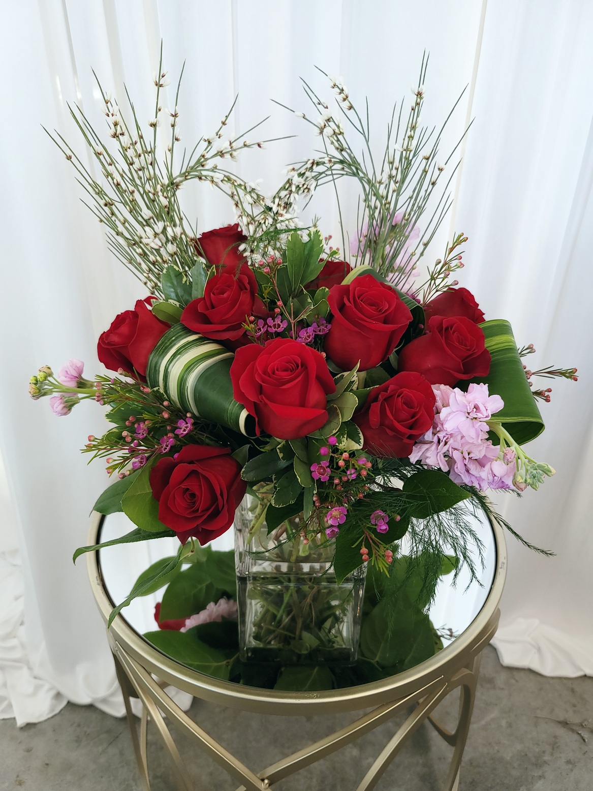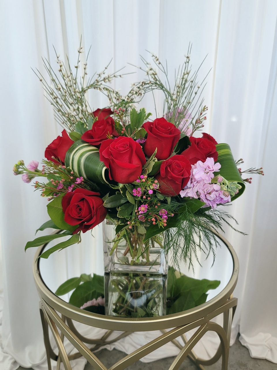 Do a dozen roses differently this year! This modern and sleek design of 12 red roses, rich foliage and elegant filler features a romantic heart of fresh Ginestra and is set in a timeless clear glass square vase. A stunner for sure!