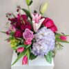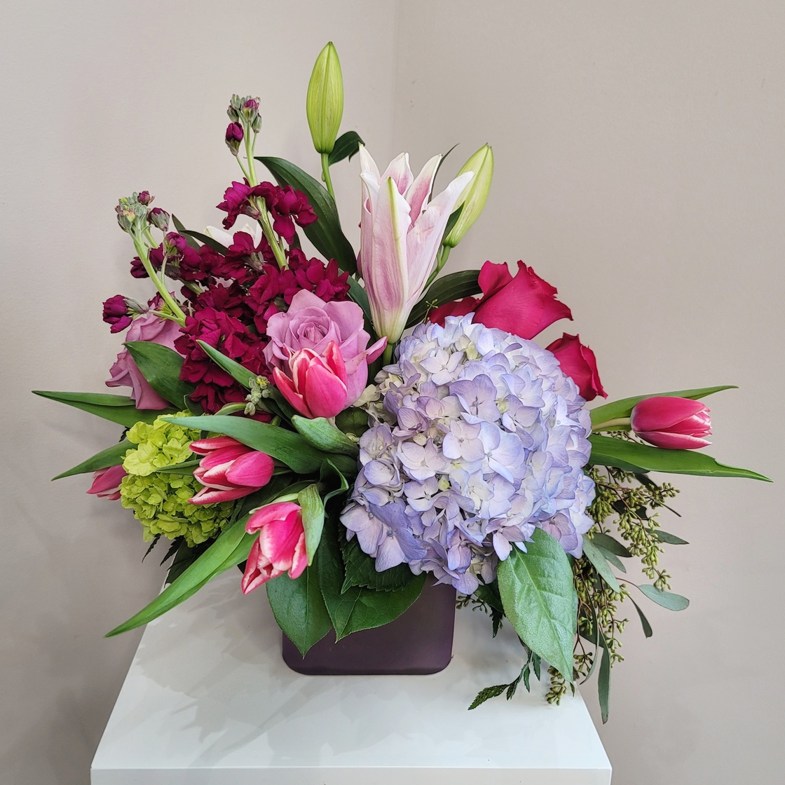 A bountiful garden gathering of hydrangea, roses, tulips, stock and lillies in spring-toned pinks, purples, and lime are displayed in a pastel frosted glass cube vase. A modern garden party in the making!