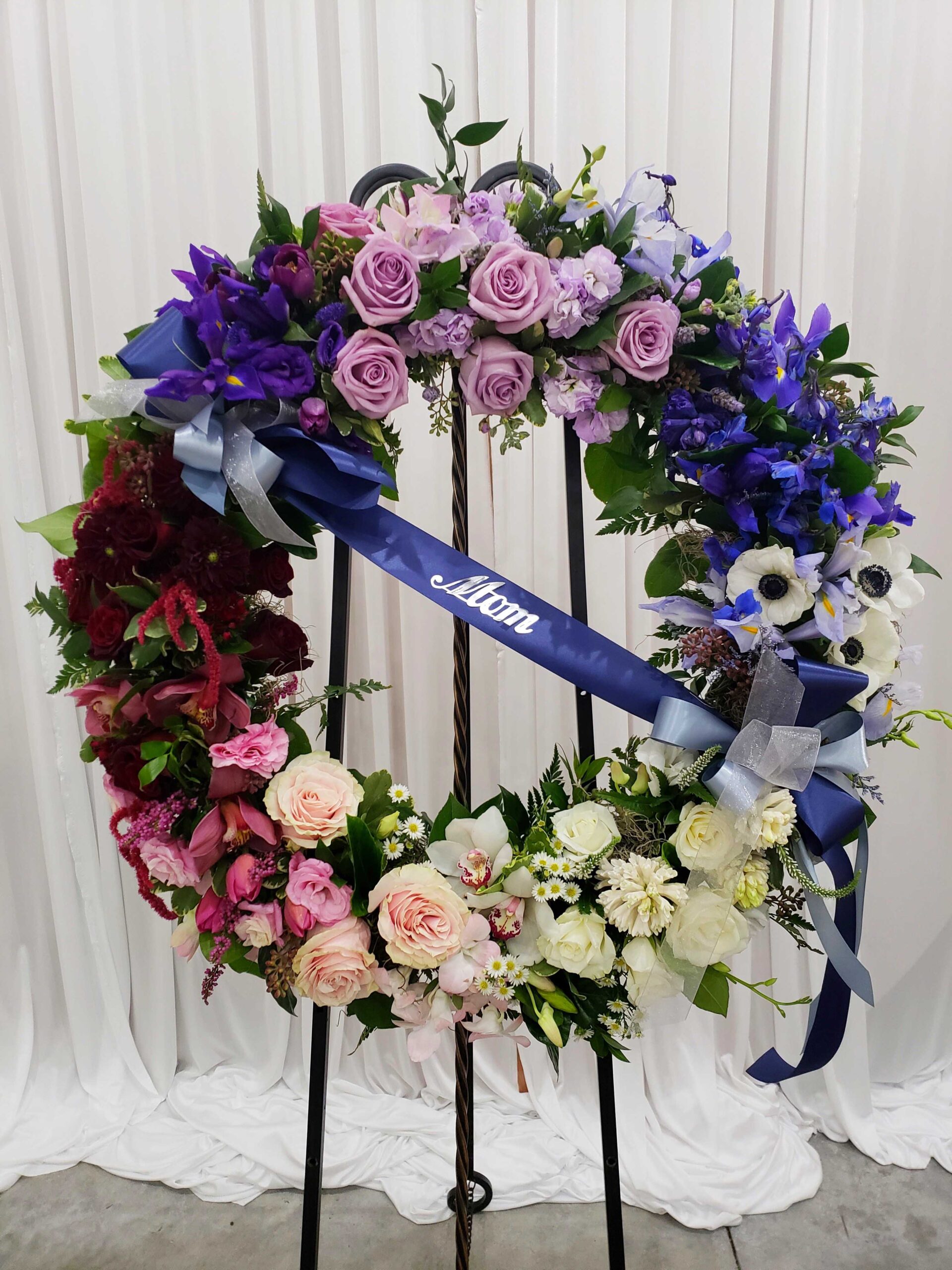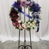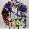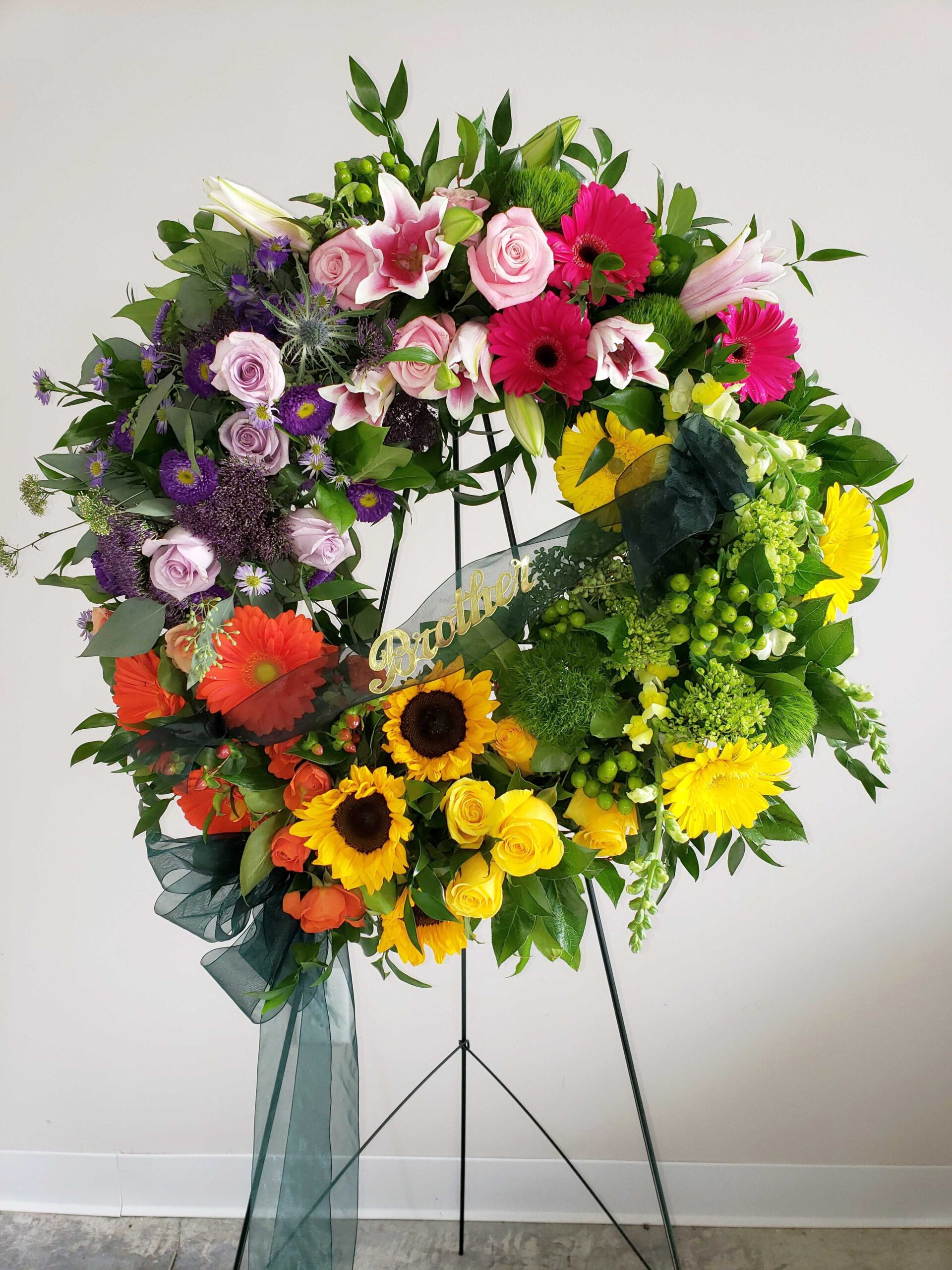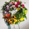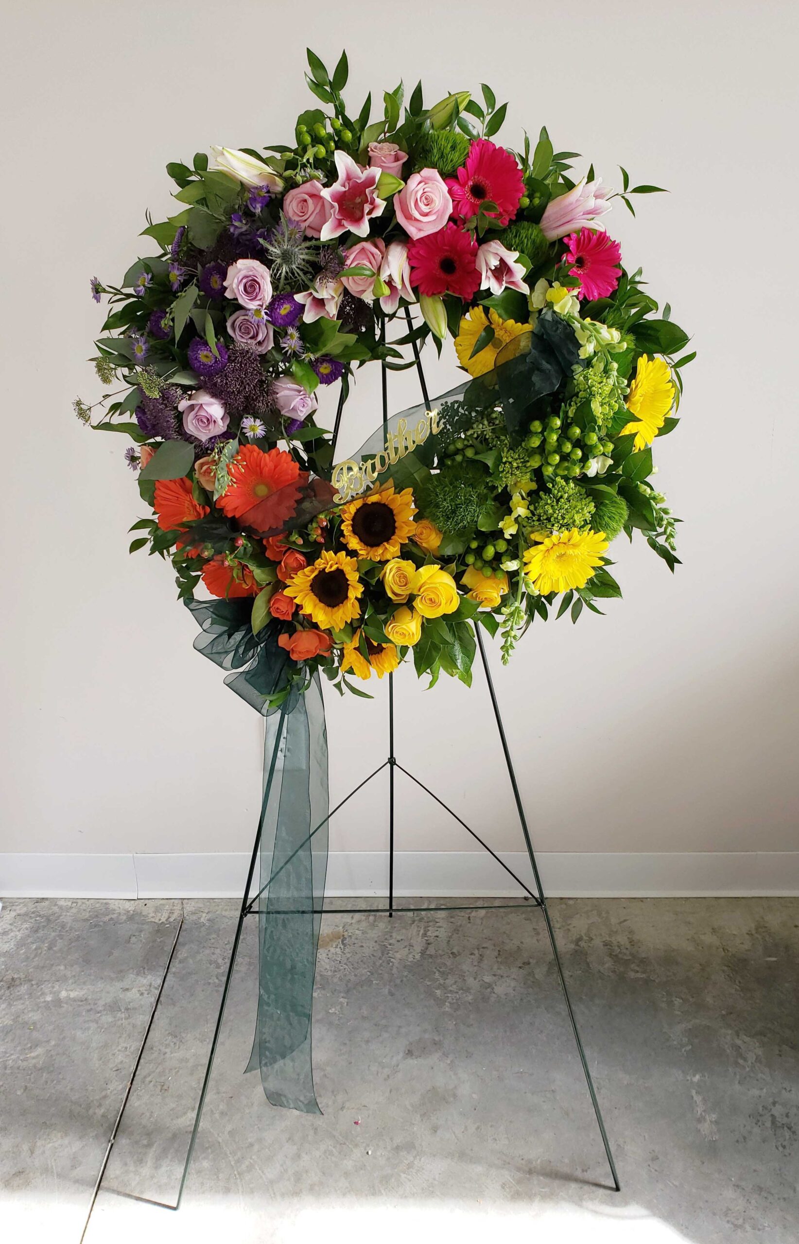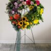 Wreath of full flowers and lush greenery displayed on a green wire easel. Flower types selected to highlight preferred colors. Please indicate color choices below. Ribbons and script optional, please provide wording below.