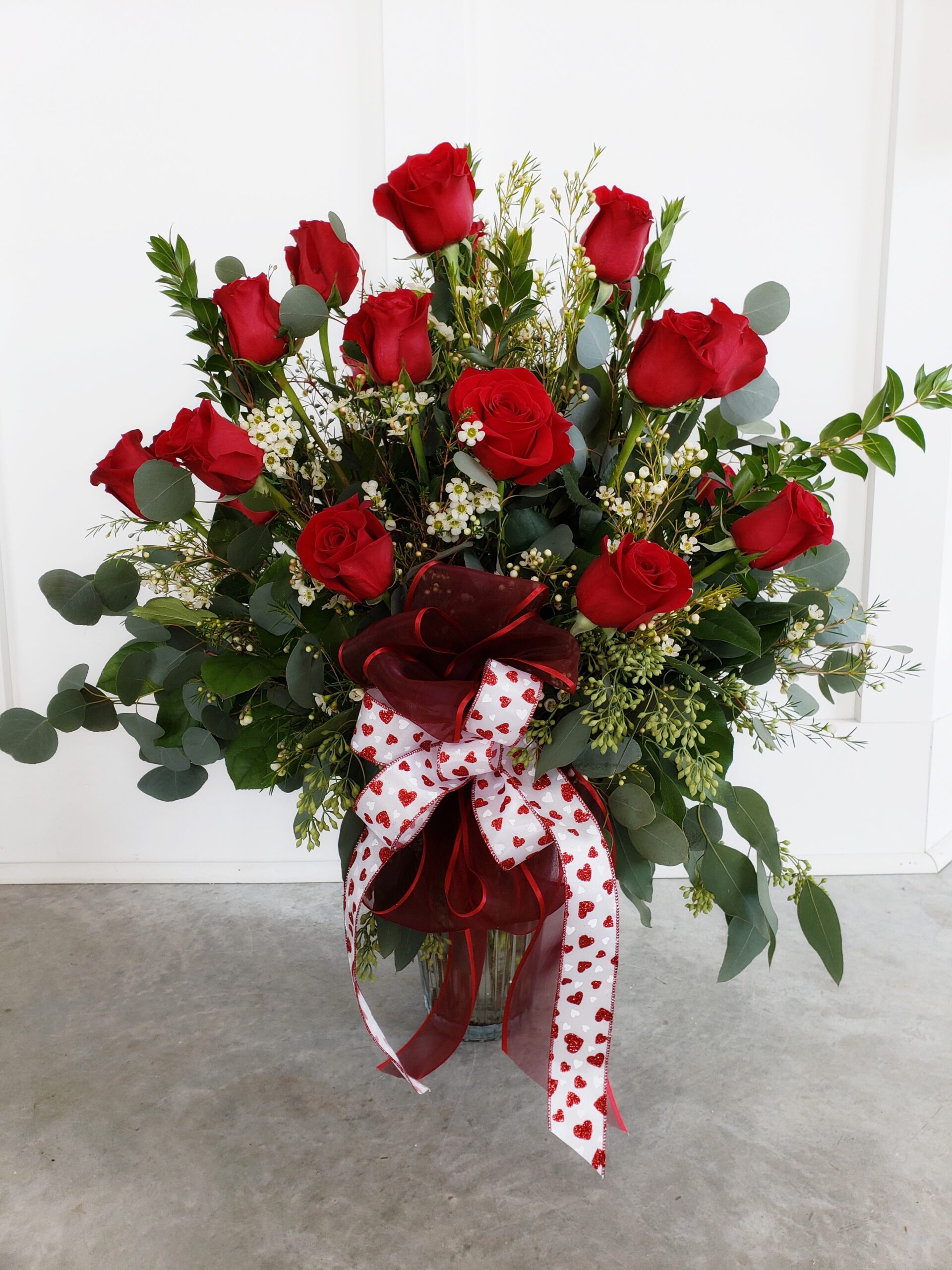 Two dozen long stem, red roses artfully arranged with mixed greenery and filler. Festive bow completes this showy look. *Please specify color in requests section if color other than red is preferred.