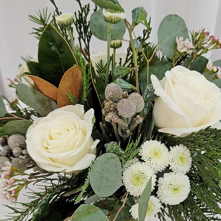 This hand-tied bouquet features white flowers, winter textures, and greenery. Flowers to be wrapped for presentation. *No vase included.
